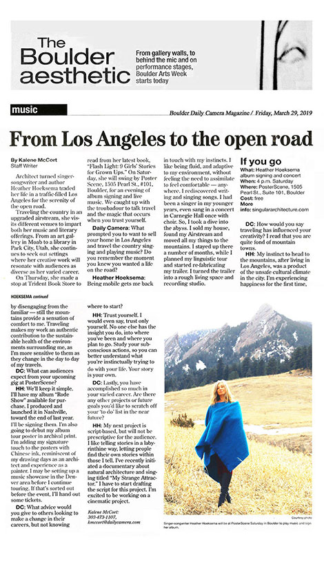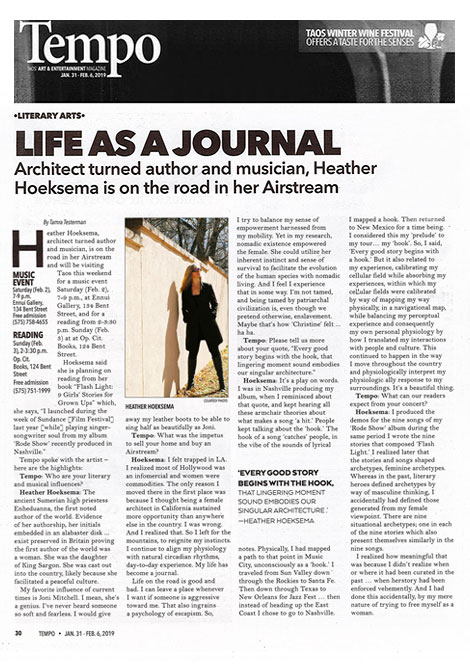 critiques. She produced her first singer songwriter album and toured nationally (2017-2019) with intimate concerts. Her second music album 'My Tessitura' is in progress. Her work on Chaco Canyon is accompanied by a scientific theory titled 'Sineverse Proofs'. Her related talks integrate ideas about natural science, culture, and architectonics translating transcendentally between cosmic and human scales of life.